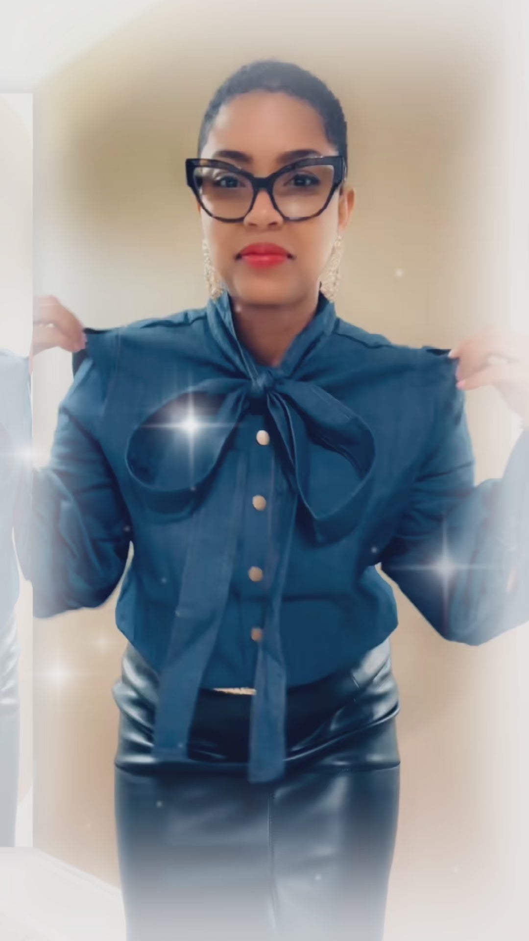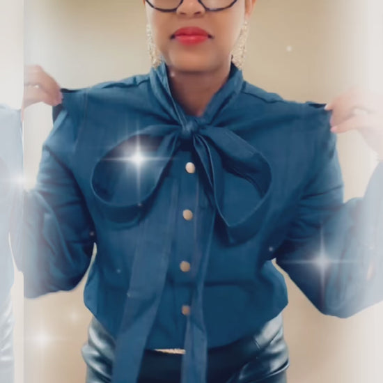 Tie neck top with long belled sleeved button down top. Chic style for casual or corporate wear. Light weight material with minimum stretch in upper arm area.